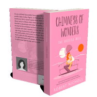 “A pink-toned book cover featuring a person reading on a bench with a large moon in the background.”