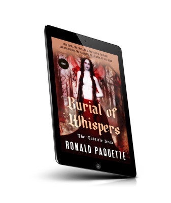 “A mysterious woman with long red hair and a red skirt stands in a mystical forest. The title "Burial of Whispers" is prominently displayed.”