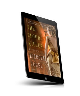 “A woman in a gold dress with an open back stands in an opulent room. The text overlay on the image is related to a book cover.”