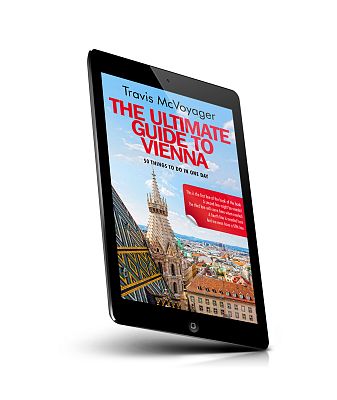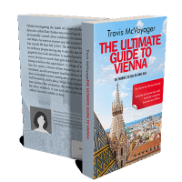 “A detailed image of Vienna with its architecture under a blue sky. A pointed roof in the foreground and cityscape in the background.”