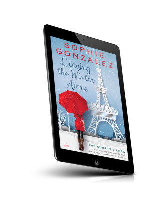 “A woman holding a red umbrella stands in front of a snowy Eiffel Tower, with snowflakes falling around her.”