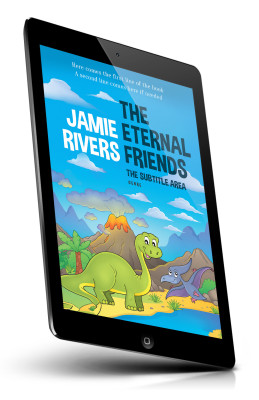 Tags: dinosaur, volcano, pterodactyl, cartoon, green dinosaur, blue sky, children, book cover, smiling dinosaur, clouds, landscape, mountains, tropical plants, lava, animated characters, kids book, prehistoric, friendly, dinosaur scene, adventure
