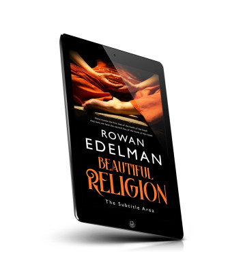 “A person in orange clothing sits cross-legged with hands on their lap. Below is a book cover with the title "Beautiful Religion" by Rowan Edelman.”