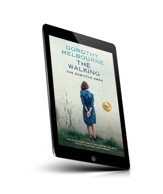 “A woman in a blue dress stands by a body of water, seen from behind, on a book cover titled "The Walking."”