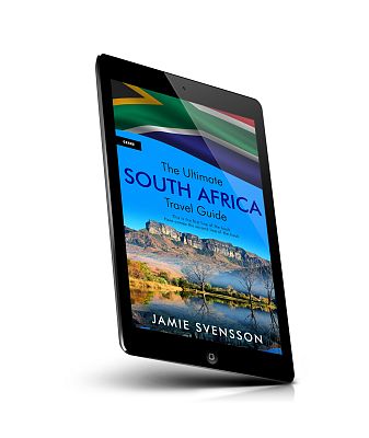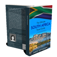 “A book cover featuring the South African flag, a mountainous landscape reflection, and the title "The Ultimate South Africa Travel Guide".”