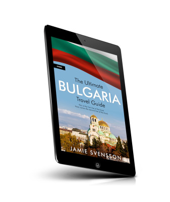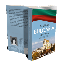 “A travel guide cover shows a picturesque Bulgarian cityscape with a prominent domed building, beneath a Bulgarian flag.”