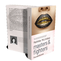 “A close-up of lips with black and gold lipstick, above a book cover featuring bold text.”