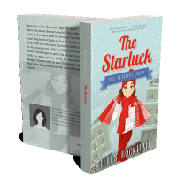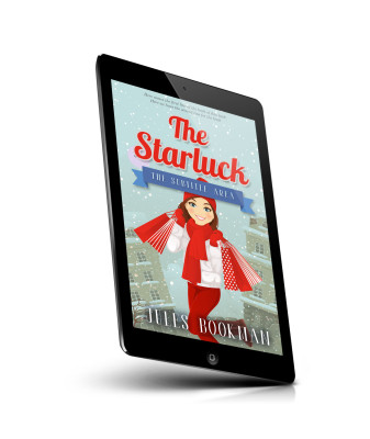 “A smiling woman in winter attire holds shopping bags in a snowy town background with buildings. The cover has festive colors and a title.”