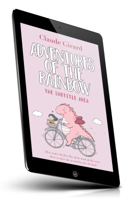 “A pink dragon is riding a bicycle with a girl in the basket, set against a pink background with clouds.”