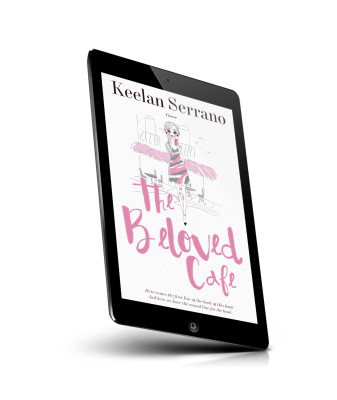 “A stylishly sketched woman stands confidently in front of a café backdrop with pink and gray tones.”
