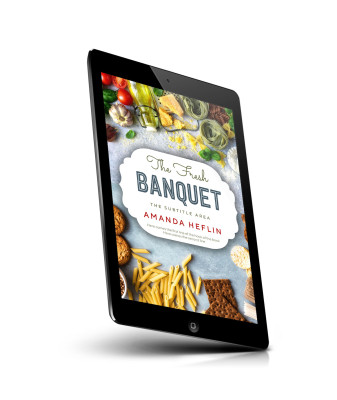 “An assortment of fresh ingredients surrounding a book cover titled "The Fresh Banquet" by Amanda Heflin.”