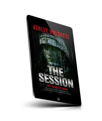 “A dark, matrix-like background with a shadowy figure in sunglasses and a hood, title "The Session" in bold metallic letters.”