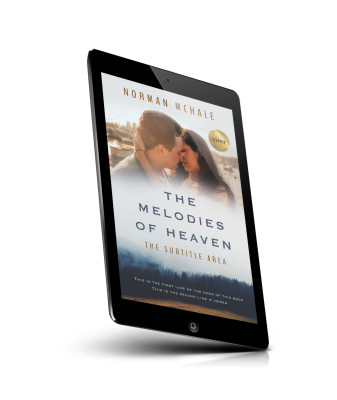 “A couple embracing against a scenic cityscape, with a forest landscape below. The book cover features a romance theme.”