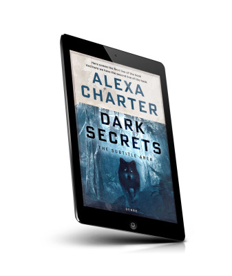 “A dark forest scene with a wolf in the center, beneath the title "Dark Secrets" and an author's name.”