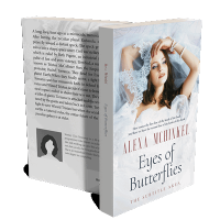 “A woman with long brown hair in a white lace veil gazes upward. The book's title and author’s name are displayed below her.”