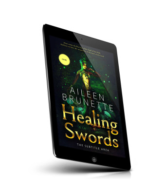 “A fantasy-themed book cover featuring a mystical, glowing figure in a green forest setting, with the title "Healing Swords" prominently displayed.”