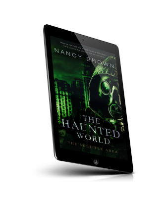 “A person in a gas mask stands in front of an eerie, green-lit cityscape with tall buildings.”