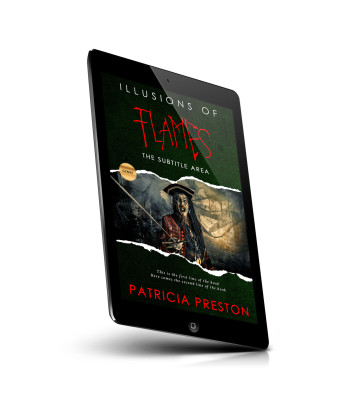 “A pirate with a long beard and hat holds a weapon, surrounded by a mystical, dark background. Book title: "Illusions of Flames."”