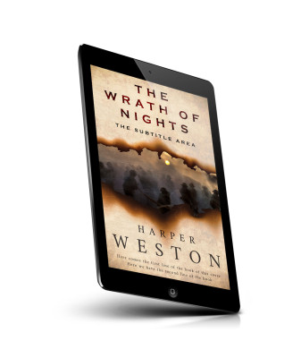 “Weathered book cover with a torn effect revealing silhouetted figures in a dusty, sunset-lit landscape.”