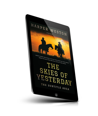“Two cowboys on horseback against a sunset, with birds flying in the sky. Book cover with a western theme.”