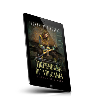 “A hooded character holds a glowing staff, sitting against a gritty, industrial background. Sci-fi/fantasy themed book cover.”