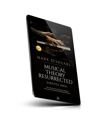 “A person's hands playing piano with a book cover titled "Musical Theory Resurrected" by Mark Beshears and a subtitle area.”