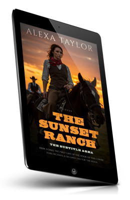 “Woman on horseback in front of a sunset, wearing a vest and bandana. Another rider is visible in the background.”