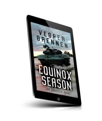 “A tank moves through water under a dramatic sky, with bold text overlaying the image.”