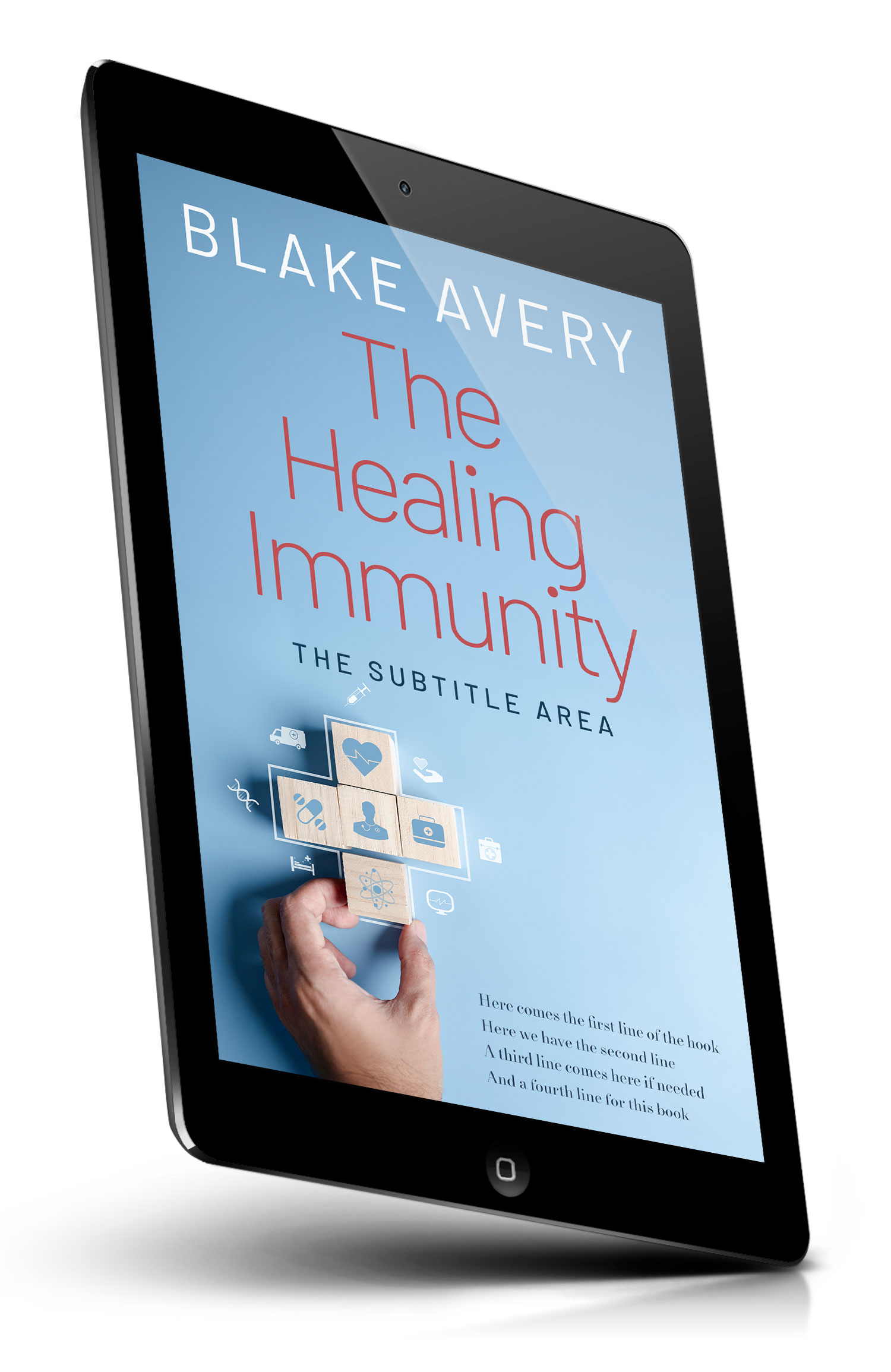 Tags: health, healing, immunity, immune system, medicine, healthcare, wellness, medical icons, medical cross, wooden blocks, hand holding, blue background, heart icon, syringe, ambulance, first aid, dna helix, atom symbol, hospital bed, medical kit