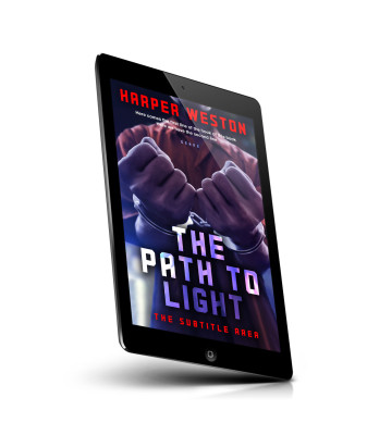 “A close-up of hands in handcuffs with a mysterious, intense background. Book title is "The Path to Light" by Harper Weston.”