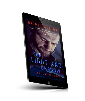 “A solemn man looks downwards; the background is dark and mountains are at the bottom. The title "The Light and Shadow" is prominent.”