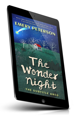 “A small house with a red roof under a starry night sky and a shooting star, surrounded by leafless trees and a dark green landscape.”