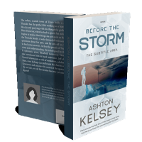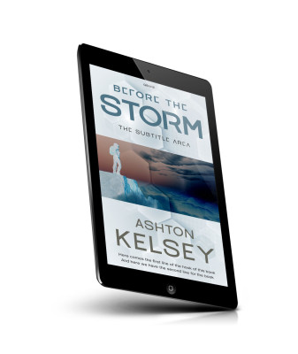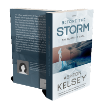 “A figure stands on an icy cliff with ominous clouds in the background on a book cover titled "Before the Storm."”