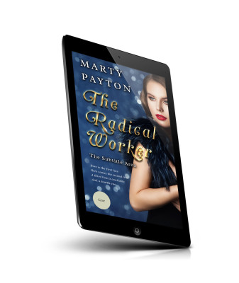 “Woman in a fur stole with bold makeup against a glittery background, text overlaid on the image promoting a book titled "The Radical Worker."”