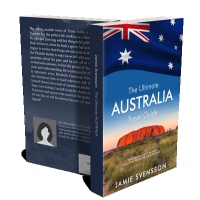 “A travel guide cover featuring Australia's flag and Uluru at sunset, with a serene landscape beneath a clear, twilight sky.”