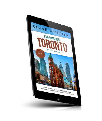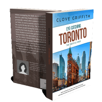 “A book cover featuring a historic red brick building in downtown Toronto with modern skyscrapers in the background under a clear blue sky.”