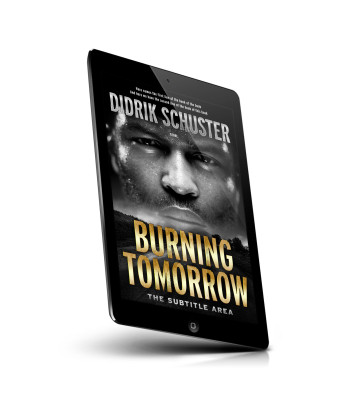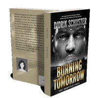 “A close-up of a man's face with intense expression, set above the title "Burning Tomorrow" in bold letters, against a dark, gritty background.”