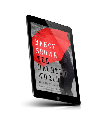 “Person holding a red umbrella in the rain with the book title "The Haunted World" displayed prominently.”