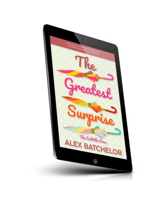 “Three colorful umbrellas with the text "The Greatest Surprise" in bright colors on a light green polka dot background.”
