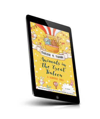 “Colorful cover with animals in a hot air balloon, surrounded by stars, clouds, and festive elements on a yellow background.”