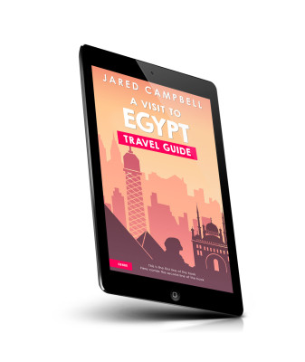 “A travel guide cover with Egyptian landmarks against a sunset background, featuring a pyramid, a mosque, and the Sphinx.”