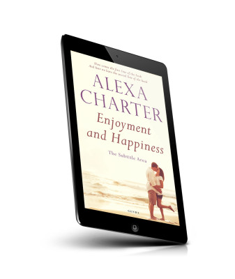 “A couple embraces on a beach at sunset; the book cover features text in large, elegant fonts.”