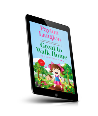 “A cheerful illustration of a girl with pigtails walking on a path, surrounded by trees, flowers, and a small house.”