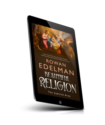 “A painting of a nativity scene with angels and surrounding onlookers, and a prominent book title and author name below.”