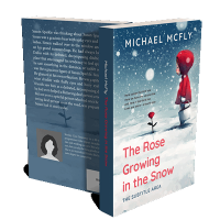 “A child in a red hooded cloak stands in the snow, holding a bucket, and gazing at a single blooming rose.”