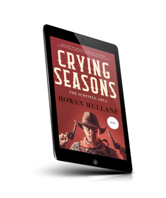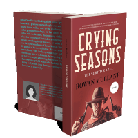 “A stern-faced cowboy holds two revolvers against a red background beneath the title "Crying Seasons".”