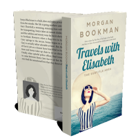 “A woman in a striped dress and large hat by the sea. Book title and author at the top.”
