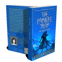 “A cloaked figure with glowing blue staff stands on a blue, patterned background. Title above: "The Capsule Trap." Author: Ashley Waldacci.”