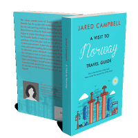 “Colorful travel guide cover with modern illustrations, showing Norwegian architecture, a lighthouse, and nature elements. Bright and inviting.”