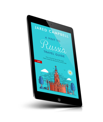 “A travel guide book cover with an illustration of Russian architecture and text in white and red on a blue background.”
